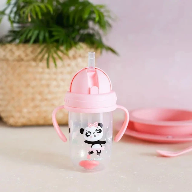 - Kubek Bidon Niekapek: Uroczy kubek z motywem misia pandy, zaprojektowany, aby ułatwić przejście od butelki do kubka. Wyposażony w funkcję niekapka, zapobiega rozlewaniu, co czyni go idealnym do nauki samodzielnego picia.
