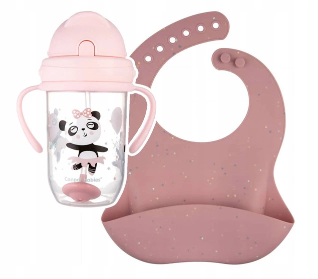 2x CANPOL Śliniaczek Sylikonowy Z Kieszonką + Kubek Bidon Niekapek RÓŻOWY