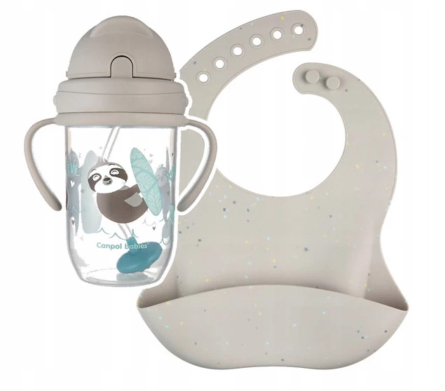2x CANPOL Śliniaczek Sylikonowy Z Kieszonką + Kubek Bidon Niekapek SZARY
