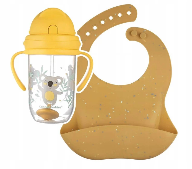 2x CANPOL Śliniaczek Sylikonowy Z Kieszonką + Kubek Bidon Niekapek ŻÓŁTY