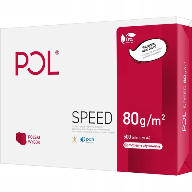 To linia papierów POL, która ma zapewnić szybkie i pozbawione zacięć drukowanie. Świetnie sprawdza się w drukowaniu wielu tekstów naraz, np. w korespondencji seryjnej. Papier POLSpeed, jak inne papiery tej marki, jest produkowany w Polsce i spełnia międzynarodowe standardy zapewniające najwyższą jakość papieru i chroniące środowisko naturalne. Idealne zastosowanie do wytwarzania dokumentacji archiwalnej, przechowywanej wieczyście.
