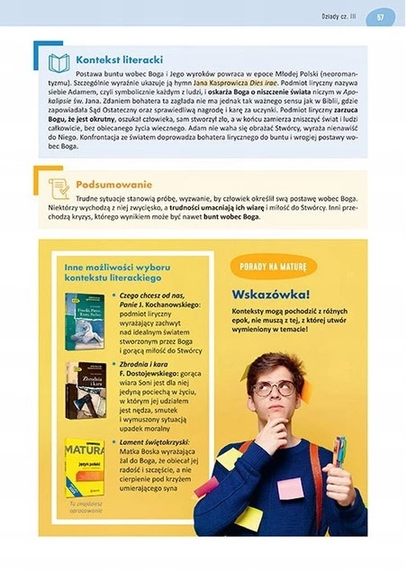 To nie wszystko - nasze repetytorium zawiera wiele innych, bardzo przydatnych dla ucznia materiałów. Znajdują się tu omówienia motywów literackich, a także krótki, lecz wypełniony treścią poradnik, jak sformułować dobrą wypowiedź ustną. Książka ma przejrzystą i nowoczesną szatę graficzną, która ułatwia korzystanie z niej i naukę.