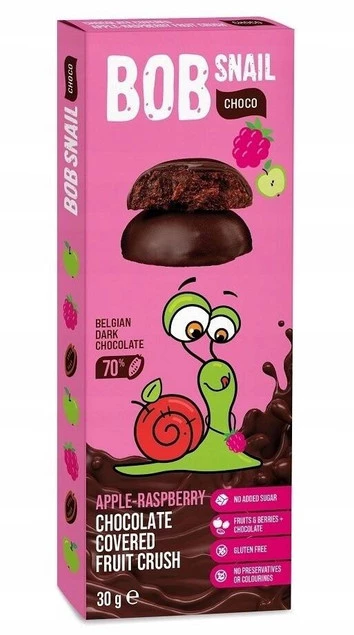 2x Przekąska Jabłko Malina W Ciemnej Czekoladzie 30g BOB SNAIL Nadzienie owocowe (77 %): jabłko 61,6 %, malina 15,4 %, czekolada ciemna (23 %): miazga kakaowa, błonnik pokarmowy (oligofruktoza), kakao w proszku o obniżonej zawartości tłuszczu, tłuszcz MLECZNY, emulgator: lecytyny (ze słonecznika), naturalny aromat waniliowy, substancja słodząca: glikozydy stewiolowe. Czekolada: masa kakaowa minimum 70 %. Bob The Snail przekąska jabłkowo - malinowa w ciemnej belgijskiej czekoladzie. Zawiera substancję słodzącą. Bez dodatku cukru. Zawiera naturalnie występujące cukry. WARTOŚĆ ODŻYWCZA W 100 g