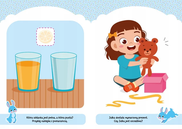 Kto jest smutny, a kto wesoły? Gdzie schował się miś? Które drzewo jest wyższe? Jakie odgłosy wydają zwierzątka? Twój dwulatek na pewno świetnie poradzi sobie z tymi zadaniami! Twórcze ćwiczenia wzbogacone kolorowymi naklejkami to wspaniała rozrywka.