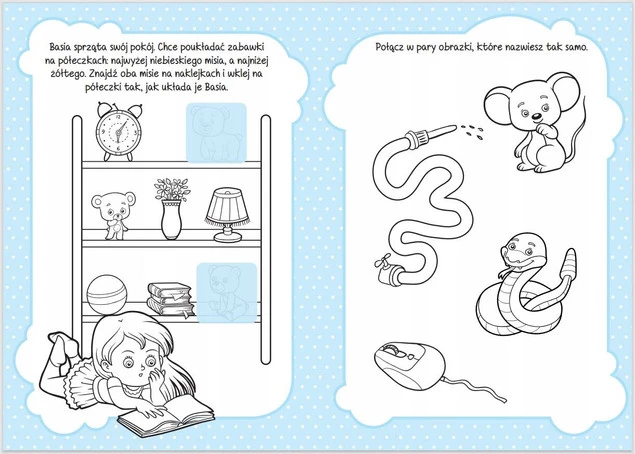 Jaki strój ma dziś Marysia, a jaki Krysia? Który wędkarz złowił rybkę? Gdzie Basia położyła żółtego misia?