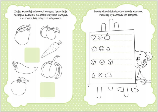 Zadania pobudzające do myślenia, by doskonalić analizę i syntezę wzrokową. Wklejanie naklejek, rysowanie po śladzie i łączenie elementów, by ćwiczyć sprawność manualną. Sięgnij po zeszyt pełen wesołych ćwiczeń, by zapewnić maluchowi wspaniałą rozrywkę i pomóc mu w rozwijaniu ważnych dla każdego przedszkolaka sprawności.