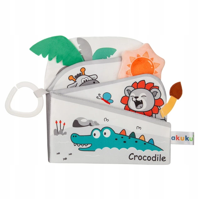 - kolorowe ilustracje – radosne postacie zwierząt (hipopotam, lew, krokodyl, motyl i inne) oraz żywe kolory przyciągają uwagę dziecka i stymulują rozwój wzroku,