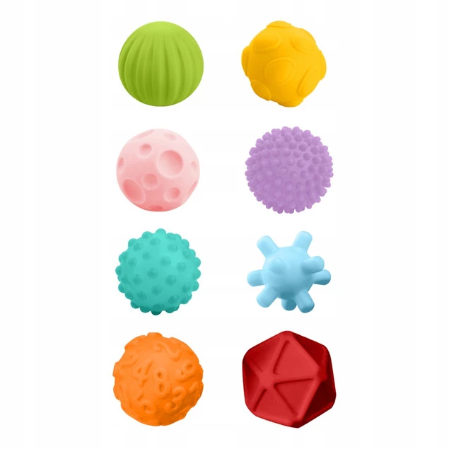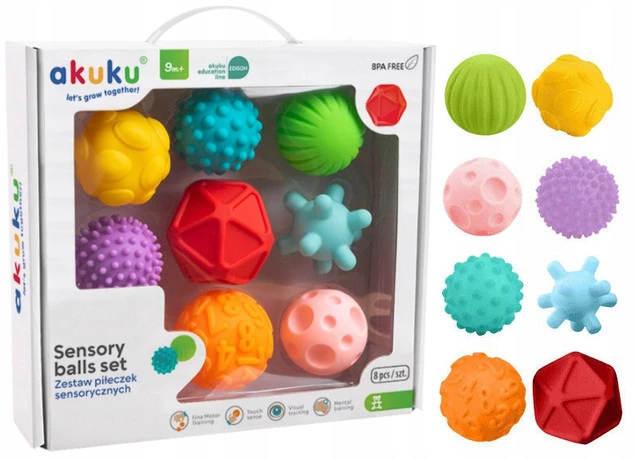 Zestaw 8 miękkich gumowych piłeczek sensorycznych marki „akuku” wprowadzą Twojego maluszka w świat zmysłu dotyku, koloru i dźwięku.