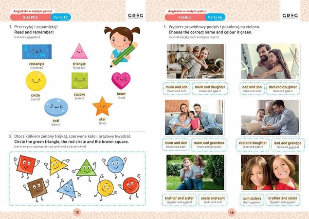 ✔Znajdują się tutaj działy tematyczne pozwalające opanować najpotrzebniejsze słownictwo z danego zakresu - a więc kolory, jedzenie i picie, ubrania, szkoła, zwierzęta, miasto, zawody itp. W publikacji zamieszczono także ćwiczenia pozwalające poznać liczby, litery, podstawowe kształty czy dni tygodnia i miesiące w języku angielskim.