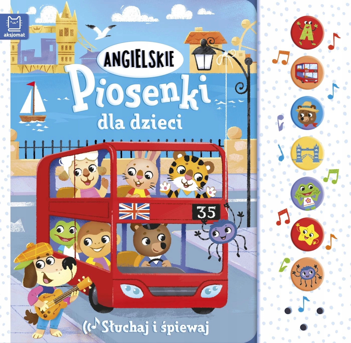 Słuchaj i śpiewaj razem z nami! W książeczce znajduje się siedem lubianych i popularnych piosenek w języku angielskim, przekazywanych z pokolenia na pokolenie. Kolorowe ilustracje i zapisany tekst każdej z piosenek zachęcą dziecko do wspólnego śpiewania. Książeczka zachęci dzieci do nauki języka angielskiego. Będzie przy tym bardzo pomocna: dziecko może zapoznać się z pisownią jak i wymową danych słów i zdań. Teksty zapisane są na białym tle, dużymi czytelnymi literami. Otoczone są kolorowymi ilustracjami, nawiązującymi do treści piosenek. Pomogą one dzieciom zrozumieć piosenki i zachęcą je do wspólnej zabawy. Piosenkę można włączyć naciskając kółeczko z obrazkiem, po prawej stronie książki. Jedno kółeczko odpowiada jednej piosence. W każdej chwili można wyłączyć grającą melodię, ponownie naciskając kółeczko. Książka działa na baterię, którą można wyjąć i wymienić. Istnieje również możliwość wyłączenia grających piosenek, przesuwając guzik przy baterii.