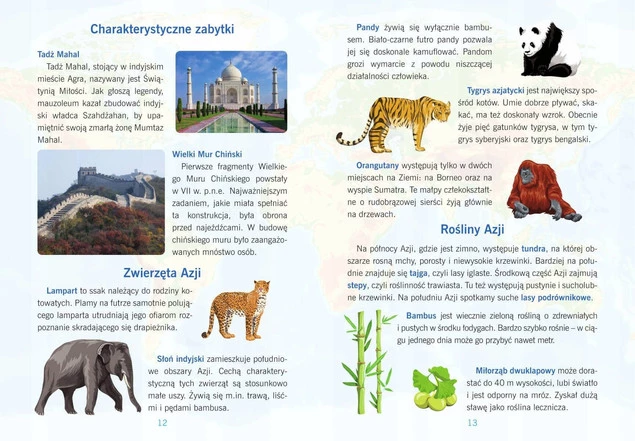 Poznasz państwa, niezwykłe miejsca, zabytki, a także rośliny i zwierzęta Europy, Azji, Afryki, Ameryki Północnej, Ameryki Południowej, Australii i Oceanii oraz Antarktydy. Przejrzyste mapy, ilustracje i zdjęcia pomogą ci w zdobywaniu wiedzy o wszystkich kontynentach.