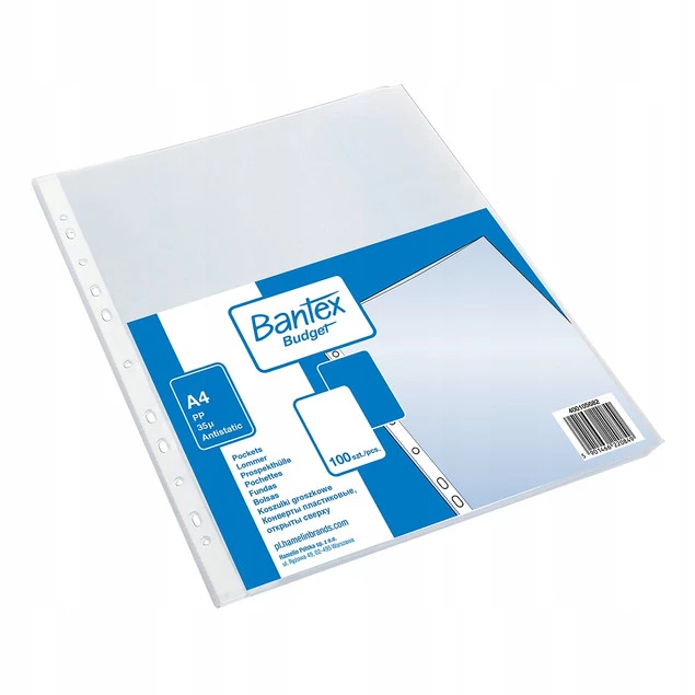 Groszkowe koszulki Budget w formacie A4, otwierane od góry. Przezroczysta, polipropylenowa folia jest antystatyczna i antyrefleksyjna, co ułatwia przechowywanie koszulek oraz zapewnia doskonałą czytelność dokumentów. 100 SZT. koszulek zapakowanych w folię, dzięki czemu zajmują niewiele miejsca.