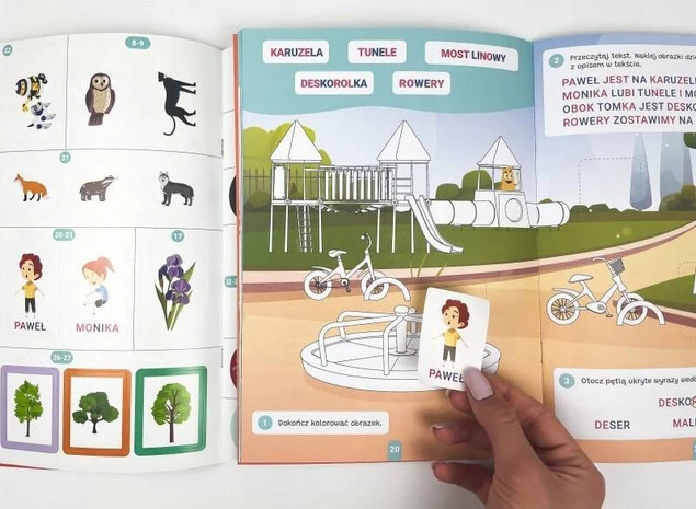 Na każdej rozkładówce znajdują się duże ilustracje z dymkami dialogowymi oraz krótkie czytanki, które ułatwiają płynne czytanie ze zrozumieniem i skutecznie angażują uwagę dzieci w wieku przedszkolnym i wczesnoszkolnym.