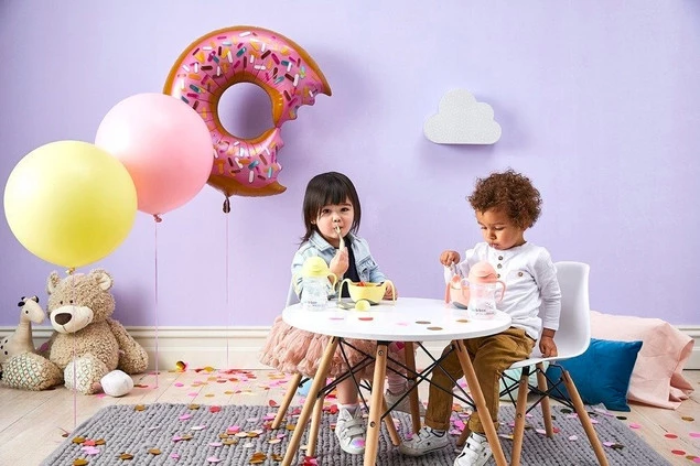Jedyny bidon na rynku, z którego dziecko może pić przechylając go do góry nogami, tak jak z butelki. Niezastąpiony kubek do picia w domu, w podróży, na spacerze. Razem z podwójną miseczką na ulubione przekąski oraz podróżnym śliniakiem stanowią świetny „posiłkowy niezbędnik”.