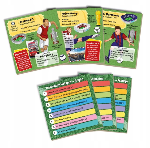 BrainBox - Piłka nożna to nie lada wyzwanie dla wszystkich fanów futbolu. Na 55 kartach znajdziesz 440 pytań dotyczących słynnych klubów piłkarskich i najpopularniejszych piłkarzy z całego świata. Za pomocą wspaniałych ilustracji i zabawnych ciekawostek, gra przybliża sylwetki najznamienitszych zawodników z najwyższych europejskich lig, drużyn z Ameryki Południowej, a nawet dalszych zakątków globu.