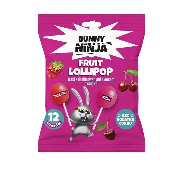 Lizaki owocowe bez cukru Bunny Ninja w 2 smakach - truskawkowym i wiśniowym. 12 lizaków w torebce, bez cukru. Naturalnie barwione owocami liofilizowanymi w proszku - są kolorowe, słodzone erytrytolem i stewią. Lizaki są w kształcie kulki.