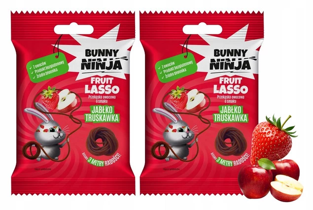 Bunny Ninja LASSO to przekąska jabłkowo - truskawkowa w formie długiego sznurka z owoców. Sznurek / żelek można urywać i zjadać po kawałku. Mocno owocowa przekąska powstała m.in. z jabłek, truskawek. Puree i soki owocowe zagęszczone pektyną (bez żelatyny) tworzą przekąskę w formie długiego żelka.