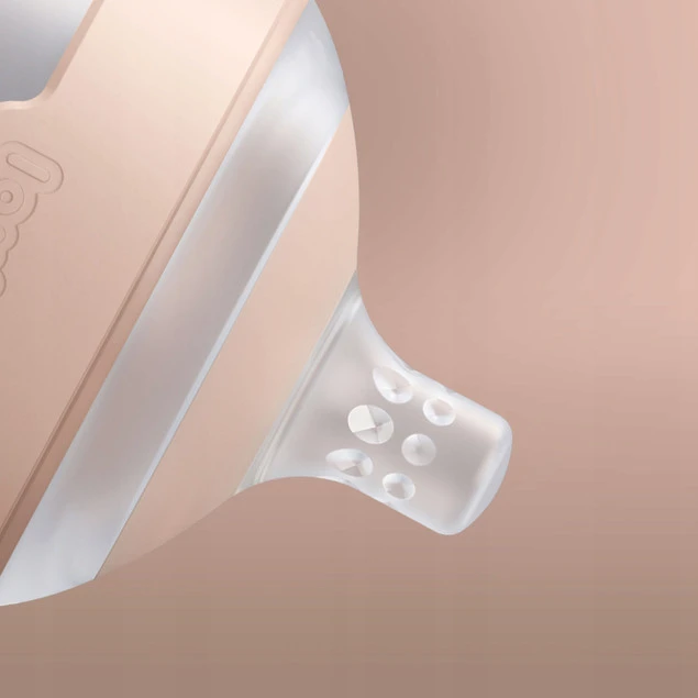 - Poprzez prawidłowe uszczelnienie warg na smoczku oraz optymalny kąt rozwarcia ust