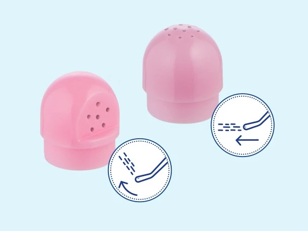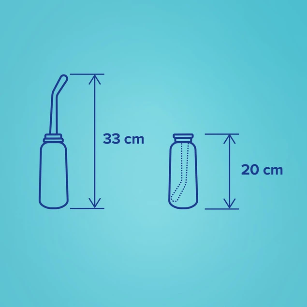 Odwrócona butelka z szyjką o długości 17 cm po ściśnięciu uwalnia strumień wody pod wybranym kątem. Ułatwia podmywanie się i dotarcie do trudno dostępnych miejsc bez schylania się lub w ciąży, gdy brzuszek utrudnia czynności higieniczne.​