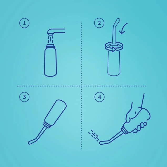 1. Będąc w toalecie, wlej do butelki ciepłą wodę i mocno zakręć nakrętkę. Butelka posiada 2 końcówki z różnym kątem strumienia dla wygodnego użytkowania.​