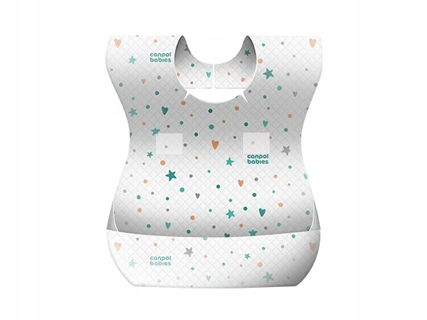 Miękki i wygodny śliniak, który skutecznie zabezpiecza ubranko dziecka przed zabrudzeniem. Dzięki zapięciu na szyi oraz dodatkowym samoprzylepnym paskom mocującym, śliniak dobrze trzyma się na miejscu i nie przesuwa się podczas jedzenia.