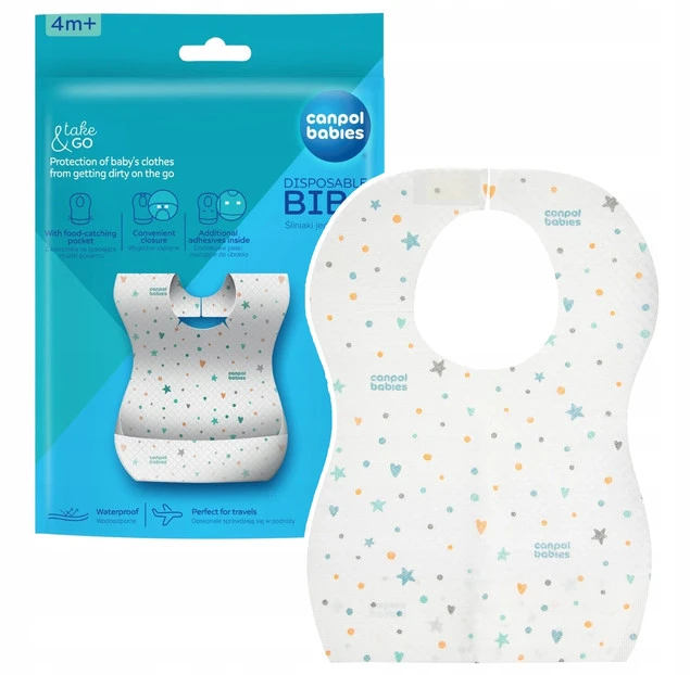 Wodoodporne śliniaki jednorazowe z kieszonką Canpol babies 10 szt to wygodna alternatywa dla klasycznych śliniaków materiałowych, która doskonale sprawdza się w podróży i podczas spacerów. Chłonna warstwa wierzchnia i wodoodporny spód zabezpieczają ubranko maluszka przed zabrudzeniem, a wywijana kieszeń wyłapuje spadające resztki pokarmu. Śliniak jest miękki i przyjemny w dotyku, a wygodne zapięcie sprawia, że jest bardzo łatwy w użyciu. Posiada dodatkowe paski samoprzylepne mocujące śliniak od wewnątrz do ubranka. Każdy śliniak spakowany jest osobno w folię, dzięki czemu jest higienicznie czysty i zajmuje niewiele miejsca w bagażu czy torbie mamy.