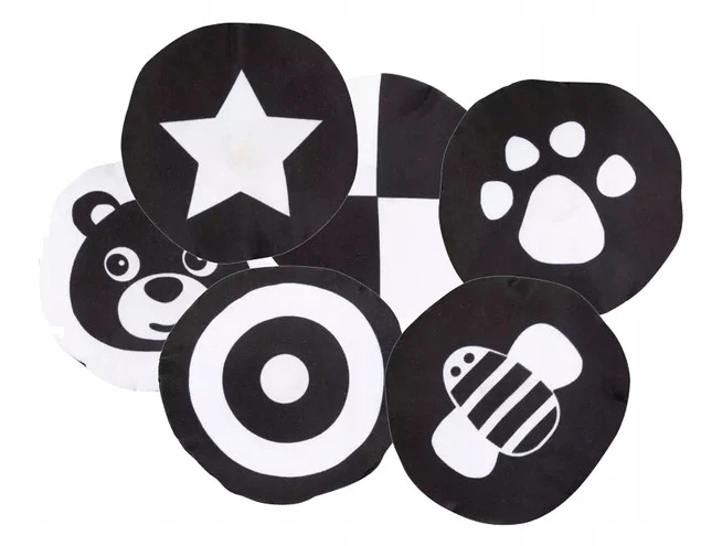 - Dwustronne elementy z możliwością zmiany stron i dostosowania do etapu rozwoju dziecka. Etap 1: kontrasty.