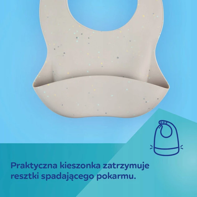 Praktyczna kieszonka zatrzymuje resztki spadającego pokarmu.