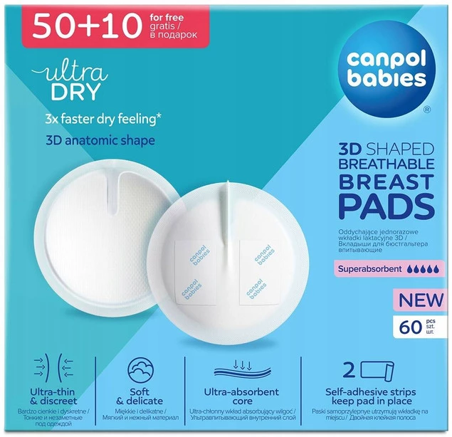 Ultrachłonne wkładki laktacyjne Canpol babies zapewniają ochronę i wyjątkowe 3x szybsze uczucie suchości i świeżości w dzień i w nocy. Są bardzo cienkie, dzięki czemu są dyskretne i niewidoczne pod bielizną i ubraniem. Mają 7 warstw ochronnych, w tym ultrachłonny wkład, który szybko wchłania płyny i zatrzymuje wilgoć wewnątrz wkładki na długi czas. Miękka wierzchnia warstwa jest delikatna dla skóry i przepuszcza powietrze, dzięki czemu pozwala skórze swobodnie oddychać i nie podrażnia wrażliwych piersi. Anatomiczny kształt 3D zwiększa komfort noszenia i sprawia, że wkładka doskonale dopasowuje się do kształtu piersi. Podwójny pasek samoprzylepny utrzymuje wkładkę na miejscu, zapobiegając przesuwaniu się jej wewnątrz biustonosza, dzięki czemu chroni bieliznę i ubranie przed zabrudzeniem, zapewniając higienę i komfort użytkowania. Wkładki laktacyjne Canpol babies nie rozwarstwiają się po wypełnieniu płynem i zachowują swój pierwotny kształt. Każda wkładka jest zapakowana osobno dla zapewnienia maksymalnej higieny. Niebielone chlorem.