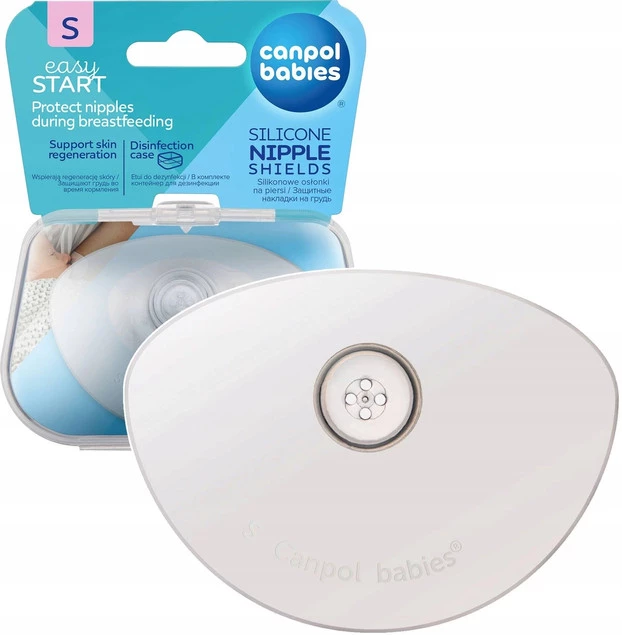 - Silikonowe osłonki ochronne na piersi w rozmiarze S, które zapewniają ochronę wrażliwych sutków podczas karmienia, a dołączone etui ułatwia ich przechowywanie.