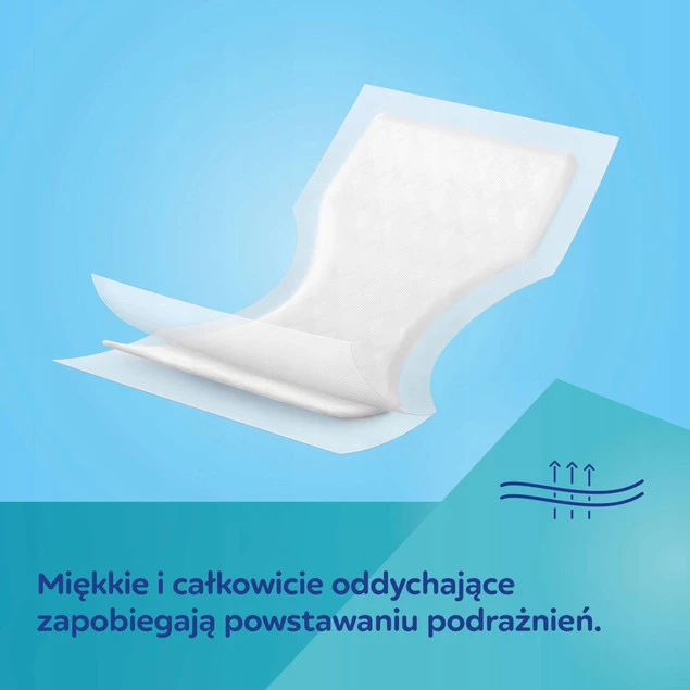 Superchłonny wkład szybko wchłania płyny i zatrzymuje wilgoć wewnątrz podkładu. Miękka i całkowicie oddychająca naturalna warstwa zewnętrzna nie rozwarstwia się i nie przywiera do skóry, dzięki czemu umożliwia swobodny przepływ powietrza i chroni przed podrażnieniami. Szeroki pasek samoprzylepny utrzymuje podkład we właściwym miejscu.