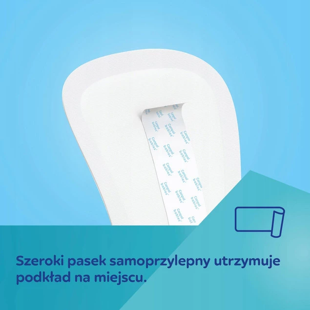 - Szeroki pasek samoprzylepny utrzymuje podkład na miejscu.