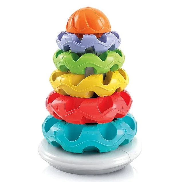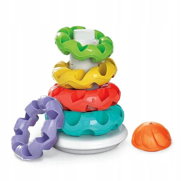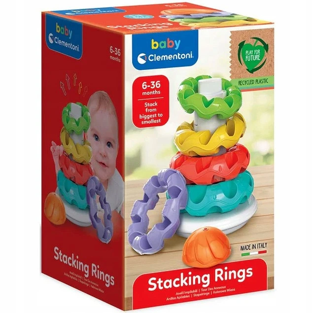 Kolorowa wieża marki Clementoni składa się z 6 kolorowych kółek i kapturka. Ten kolorowy zestaw pierścieni będzie bawić maluszka na wiele sposobów. Podstawa kołysząc się dodatkowo stymulje maluszka podobnie jak pierścienie, gdzie każdy ma inny kolor, kształt oraz wielkość, dzięki czemu dziecko uczy się poprzez wesołą zabawę.