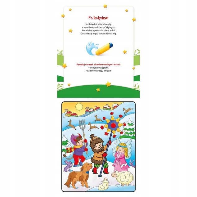 Malowanka wodna to doskonały sposób na kreatywną i edukacyjną rozrywkę, idealną na okres Bożego Narodzenia. Zabawa polega na nanoszeniu wody na ilustracje za pomocą piasku, dzięki czemu dzieci mogą odkrywać i kolorować świąteczne motywy bez ryzyka zabrudzenia lub zniszczenia kart. Po wyschnięciu obrazki znikają, co pozwala na wielokrotne korzystanie z książeczki, zapewniając długotrwałą rozrywkę.