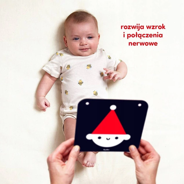 W ciągu pierwszego roku życia zmysły, mózg i wszelkie umiejętności dynamicznie się rozwijają. Po urodzeniu dziecko najlepiej widzi wyraźne, mocno kontrastowe wzory, a w kolejnych miesiącach stopniowo rozwija się zdolność rozróżniania szczegółów obrazu i kolorów. Dlatego niemowlęta tak lubią kontrasty. Pokazywanie i opowiadanie o ilustracjach buduje bliskość z dzieckiem i znakomicie stymuluje rozwój poznawczy i… motoryczny – książeczka ustawiona przez niemowlęciem znakomicie inspiruje go do podnoszenia główki! Możesz zawiesić książeczkę lub pojedyncze karty przy łóżeczku lub wózku lub stworzyć efektowną girlandę. Mnóstwo ciekawych i praktycznych informacji o rozwoju niemowląt i wspólnej zabawie znajdziesz w poradniku dołączonym do zestawu.
