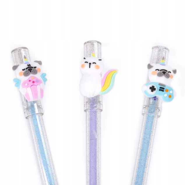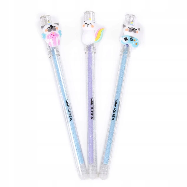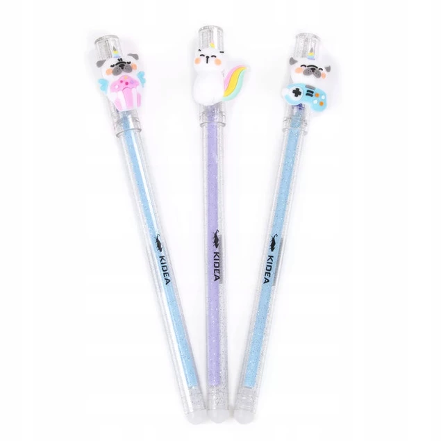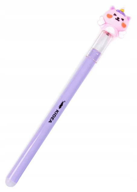 Długopis wymazywalny z przezroczystym brokatowym korpusem oraz figurką w kształcie zwierzaka. Zatyczka długopisu ozdobiona słodkim motywem uatrakcyjnia produkt i sprawia, że dzieci czerpią ogromną radość z jego użytkowania.