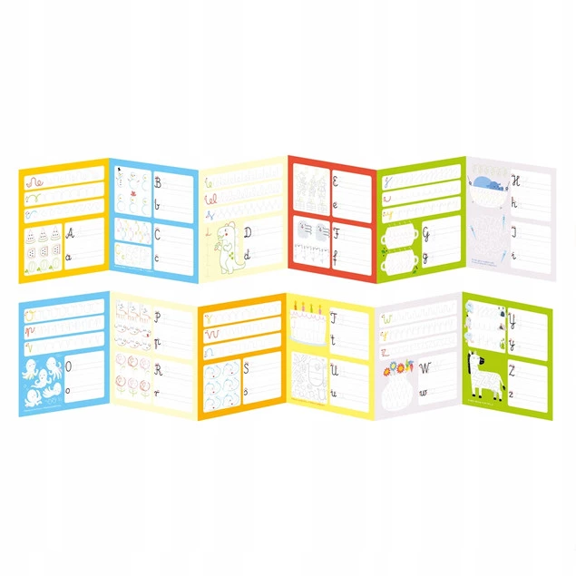 Edukacyjny zestaw zawiera 2 długie książeczki harmonijki, które zachęcają dzieci poznawania liter i podejmowanie prób pisania. Ciekawe zadania i kolorowe ilustracje pokazują, że nauka liter i ćwiczenia doskonalące rękę mogą być fascynująca zabawą. Książeczki przedstawiają litery pisane z polskiego alfabetu.