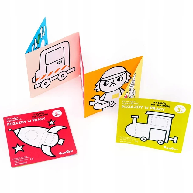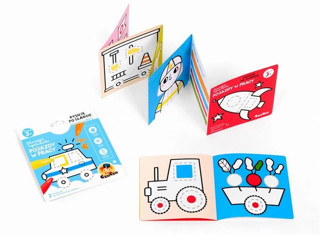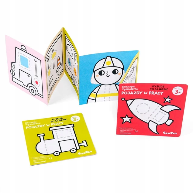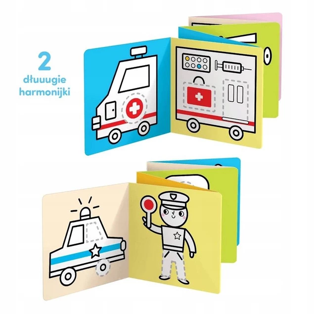 W kreatywnym zestawie znajdziecie 2 długie książeczki harmonijki, a w nich kolorowe pojazdy. Urocze ilustracje mają grube kontury i są dostosowane do wieku początkujących artystów. Lubiana przez najmłodszych tematyka zachęca dzieci do kolorowania i rysowania. Przedszkolaki potwierdzają: twórczy zestaw doskonale sprawdza się jako pierwsze kolorowanki.