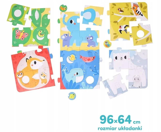 Edukacyjna układanka o imponujących rozmiarach jest kolorowa i przepięknie zilustrowana. Składa się z tradycyjnych puzzli i kółeczek, które można dowolnie przekładać, dlatego zestaw pozwala na mnóstwo wszechstronnie rozwijających zabaw. Ułożenie obrazka to tylko jedna z nich! Więcej pomysłów znajdziecie w dołączonym do zestawu poradniku.