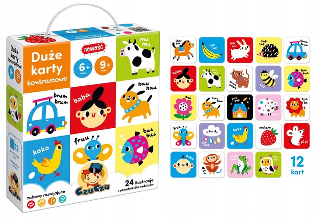 Duże karty kontrastowe od CzuCzu dla starszych niemowląt (6-9 mies.+) to wyjątkowa książeczka. Jest pełna prostych, kolorowych ilustracji, które dają ogrom możliwości zabawy. Przyciągają wzrok i uwagę malucha, zachęcają do przemieszczania się.