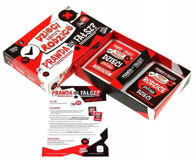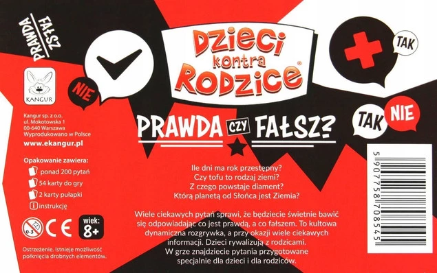 Ile dni ma rok przestępny? Czy tofu to rodzaj ziemi? Z czego powstaje diament? Którą planetą od Słońca jest Ziemia? Wiele ciekawych pytań sprawi, że będziecie świetnie bawić się odpowiadając co jest prawdą, a co fałszem. To kultowa dynamiczna rozgrywka, a przy okazji wiele ciekawych informacji. Dzieci rywalizują z rodzicami. W grze znajdziecie pytania przygotowane specjalnie dla dzieci i dla rodziców.