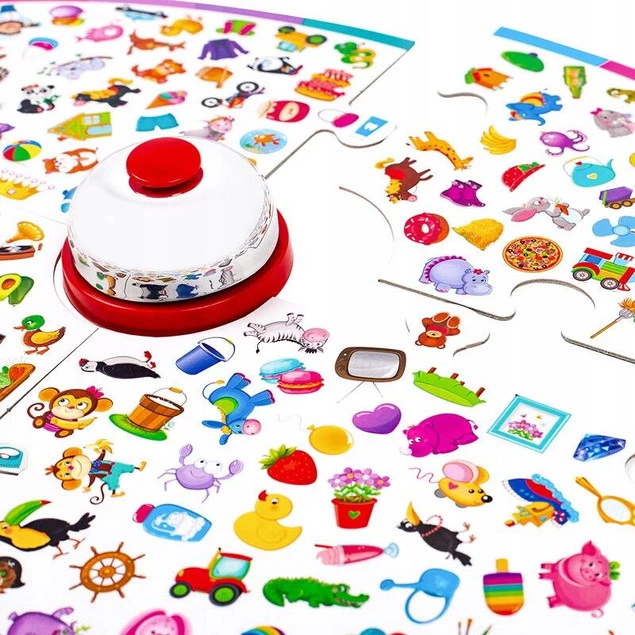 Ciekawa i dźwięczna gra dla rodziny i przyjaciół! Na wyścigi szukajcie na planszy do gry zbieżności w fiszkach i naciskajcie dzwonek!