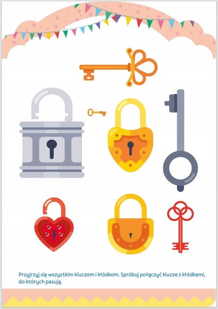 Baw się: znajduj i wklejaj naklejki, odszukuj ukryte obrazki, łącz elementy, pokonuj labirynty, wskazuj kształty i wielkości, rysuj po śladzie, koloruj.