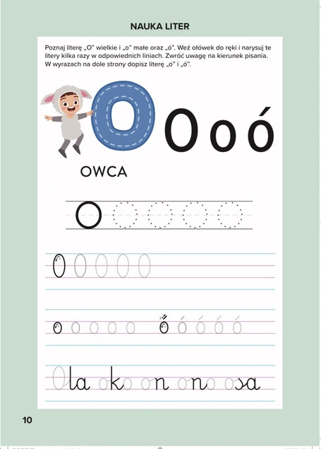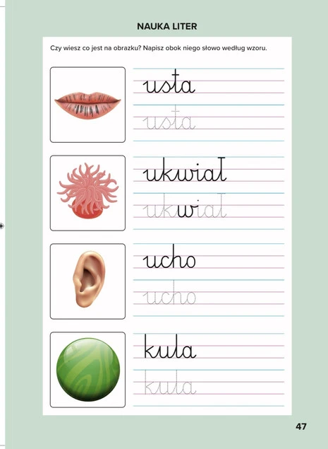 - rysowanie liter – dzieci uczą się, jak poprawnie rysować litery, co jest kluczowe w procesie nauki pisania,
