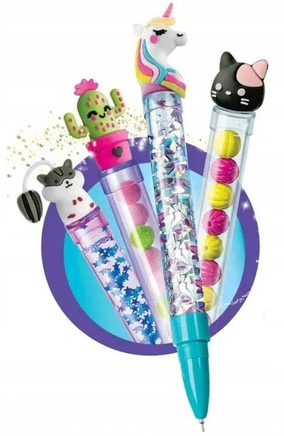 • Bogata paleta akcesoriów: 10 obudów do długopisów, 10 skuwek, 10 zatyczek, 10 końcówek, 12 wkładów atramentowych, proszek brokatowy, 6 torebek z dekoracjami, 40 mini pomponów, 32 plastikowe koraliki, 10 gumowych znaków, ilustrowana instrukcja oraz lejek