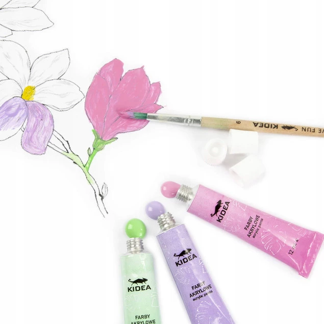 Farby akrylowe w 12 pastelowych odcieniach od KIDEA przypadną do gustu każdemu małemu artyście. Dobrze kryjące i niezwykle wydajne farbki pozwolą Ci stworzyć wyjątkowe dzieła sztuki nasycone kolorami.