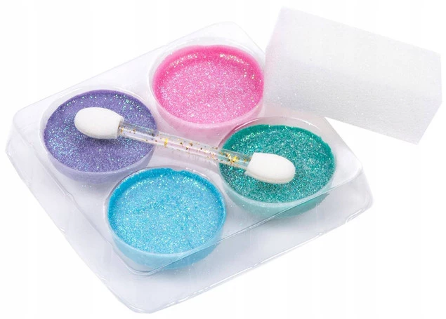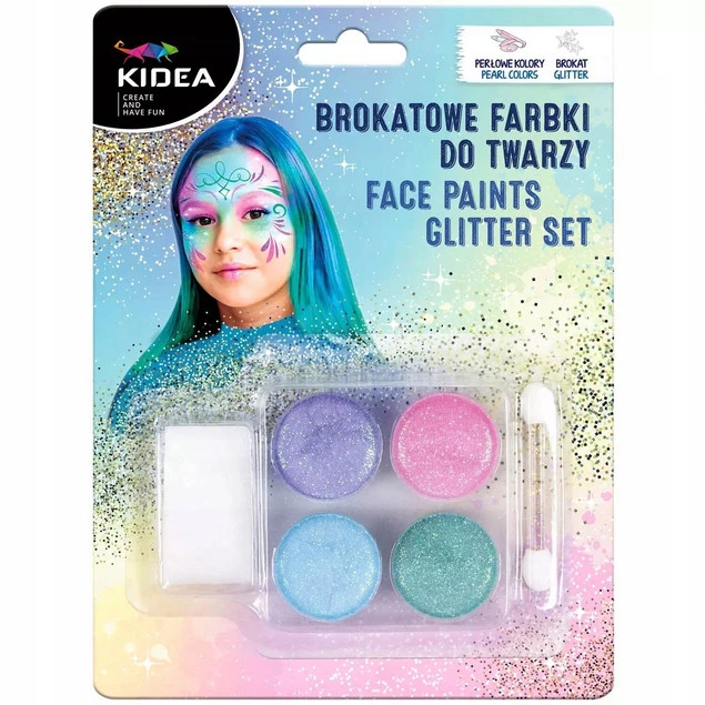 Zestaw 4 farbek do twarzy w brokatowych kolorach – fioletowym, różowym, niebieskim i zielonym. Są bardzo wydajne i wygodne w użyciu, dzięki czemu farbki wystarczą na pomalowanie wielu różnych stylizacji. Głębokie odcienie połączone z perłowym efektem i brokat pozwolą stworzyć makijaż jedyny w swoim rodzaju! Twoja stylizacja będzie mienić się i wyjątkowo błyszczeć! Zestaw zawiera aplikator, który doskonale sprawdzi się w pokryciu większych powierzchni oraz rysowaniu dokładnych kontur oraz gąbeczkę idealna do blendowania. Farbki są bezpieczne w użytkowaniu, co potwierdzają przeprowadzone testy dermatologiczne. Z tyłu opakowania instrukcja jak krok po kroku stworzyć wybraną stylizację. Stwórz spektakularny makijaż razem z KIDEA, od którego wszyscy nie będą mogli oderwać wzroku!