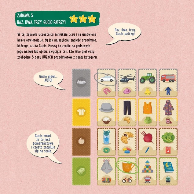„Feluś i Gucio Grają w Pary” to edukacyjna gra planszowa dla dzieci powyżej 3 lat, która wspiera rozwój poznawczy poprzez ćwiczenie spostrzegawczości, koncentracji oraz myślenia logicznego. Gra polega na tworzeniu par i dobieraniu elementów, co rozwija pamięć wzrokową i słownictwo najmłodszych graczy. Zestaw jest odpowiedni zarówno do domu, jak i do przedszkola, oferując atrakcyjną i angażującą zabawę dla 1-6 osób.