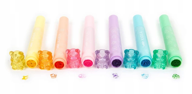 Flamastry dwustronne w 6 pastelowych kolorach: żółtym, brzoskwiniowym, różowym, fioletowym, niebieskim i zielonym. Na jednym końcu znajduje się flamaster z precyzyjną końcówką, natomiast na drugim – samotuszujący stempelek: gwiazdka, babeczka, donut, miś, kotek oraz lody.