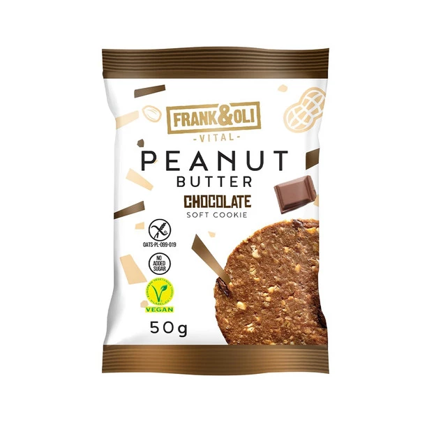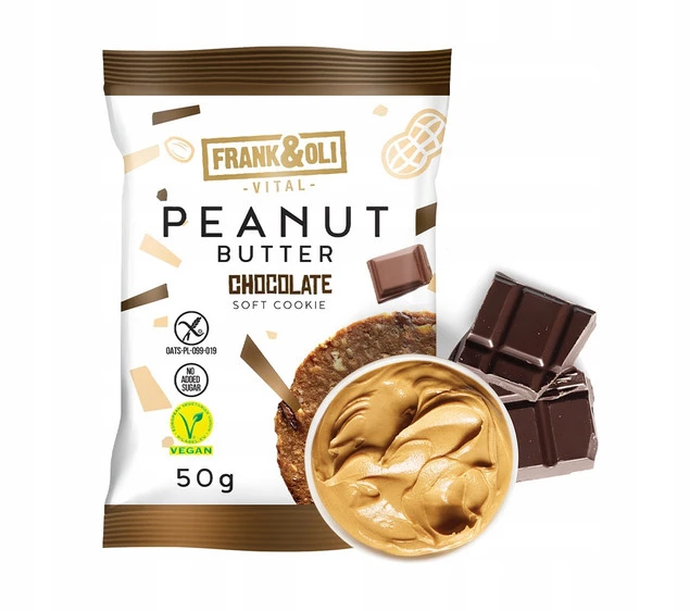Marka Frank&Oli zadbała, by miękkie ciasteczko z masłem orzechowym i czekoladą zawierało dużą ilość błonnika i było odpowiednie dla wegan. Dzięki temu możesz cieszyć się czekoladowym smakiem bez wyrzutów sumienia czy obaw przerwania diety. Na dodatek osoby nietolerujące glutenu, nie muszą martwić się o dolegliwości żołądkowe po spożyciu tej delikatnej przekąski. Produkt nie zawiera glutenu, barwników, konserwantów i ulepszaczy, bazując wyłącznie na naturalnych składnikach i substancjach.